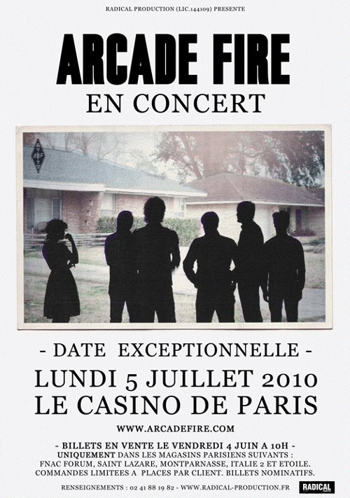 Si vous n'avez pas envie d'assister aux concerts que donnera cet été Arcade Fire en festival (Rock Werchter en juillet, Rock en Seine an août), une alternative s'offre à vous: il sera possible de fêter vos retrouvailles avec le groupe dans le contexte plus intimiste du Casino de Paris. En effet, c'est le 5 juillet que les Canadiens feront arrêt par Paris pour y présenter quelques titres de leur nouvel album prévu pour le 2 août. C'est certain, il va falloir se lever tôt et s'armer de patience ce 4 juin pour acheter un billet nominatif pour le concert dans l'un des magasins parisiens indiqués sur le flyer qui illustre la news (cliquez sur l'image pour une version agrandie). On vous souhaite déjà bonne chance!