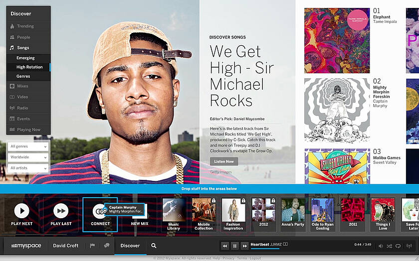 Pour l’autre plateforme, on pourrait pratiquement parler de résurrection puisque c’est rien de moins que Myspace qui s’offre une seconde jeunesse. On se souvient que, après que Rupert Murdoch avait dépensé pas moins de 580 millions de dollars pour acquérir le site en juillet 2005, ce dernier avait été revendu pour 35 millions à Specific Media Group et Justin Timberlake en 2011. La sortie de l’accrocheur « Suit & Tie » de Timberlake s’est révélée l’occasion idéale de relancer la machine Myspace, en en améliorant les fonctionnalités et, surtout, la mise en page : car si les membres ont désormais la possibilité de créer et de partager leurs propres playlists en y accédant depuis Facebook ou Twitter, c’est le design modernisé du site qui retient l’attention, tant il contraste avec les pages désuètes qu’on était habitué à y voir depuis dix ans.