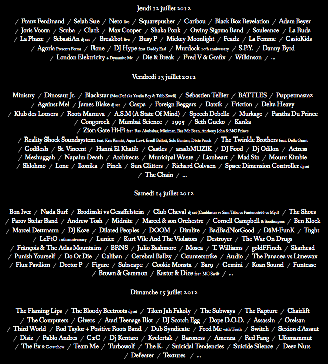 Ces derniers jours, quelques noms (et pas des moindres) sont encore venus s’ajouter à une affiche du Dour Festival qui commence à prendre sérieusement forme. En effet, sur les 200 groupes annoncés, une bonne partie a déjà été confirmée. Et parmi les plus récentes confirmations, notre équipe retient surtout celles de TNGHT (le nouveau projet de Hudson Mohwake et Lunice), Dâm-Funk Marcel Dettmann, Ben Klock , Max Cooper, DJ Koze, Mount Kimbie, Clark, Actress, The Chain, The Bloody Beetroots (dj set), Congorock, Switch, Mumbai Science, London Elektricity + Dynamite Mc, S.P.Y., Die & Break, Datsik, Figure ou encore Subscape. Beaucoup de bonnes choses donc, ce qui nous fait également dire que cette année encore, le Dour Festival va être une histiore de dilemmes. Inévitable en effet quand on jette un oeil à l'affiche provisoire et pourtant déjà très fournie...
