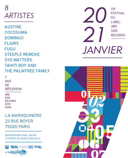 Le label français 3rd Side Records, qui compte à son catalogue de très bons artistes tels que Syd Matters , Fugu et Cocosuma, fêtera ses 7 ans les 20 et 21 janvier prochains (joyeux anniversaire !) dans le cadre d'un festival rassemblant ses poulains à La Maroquinerie (23 rue Boyer 75020 Paris).