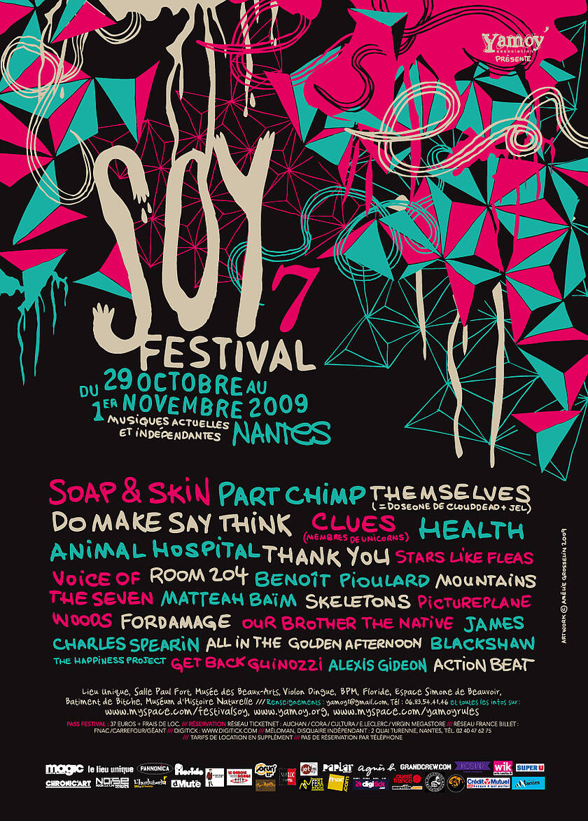 Dans le cadre de ses nombreuses activités, cette association organise depuis sept ans son festival SOY, qui se tiendra cette année du 29 octobre au 1er novembre et investira divers lieux de Nantes et de son agglomération. L'initiative est évidemment louable, mais se démarque surtout des nombreux festivals qui bourgeonnent un peu partout en France par sa programmation particulièrement pointue et pertinente, voulue par une association qui cherche à favoriser la diffusion de courants musicaux émergents n’ayant pas la possibilité d’exister au sein du système commercial.