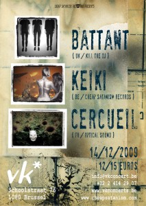 Et comme chez Cheap Satanism Records, on aime également organiser des concerts, nous vous conseillons vivement d'aller faire un petit tour du côté du VK bruxellois ce lundi 14 décembre pour y assister à la prestation de Keiki qui, pour l'occasion, sera également accompagné de deux formations pour le moins enthousiasmantes: on croisera ainsi au VK les Anglais de Battant (petits protégés du grand Andrew Weatherhall, signés sur le label Kill The DJ et produits par môôôsieur Ivan Smagghe) et les Lillois de Cercueil, les inventeurs du goth'n'roll, un genre dont les influences vont du disco à Lovecraft en passant par Boards Of Canada et Poni Hoax.